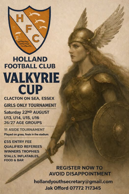 Girls-only 11-a-side tournament for U13–U16 (2026/27 age groups) at Holland FC, Clacton on Sea on 2026-08-22. £55 per team. Finals in the stadium; contact hollandyouthsecretary@gmail.com or Jak Offord to register.